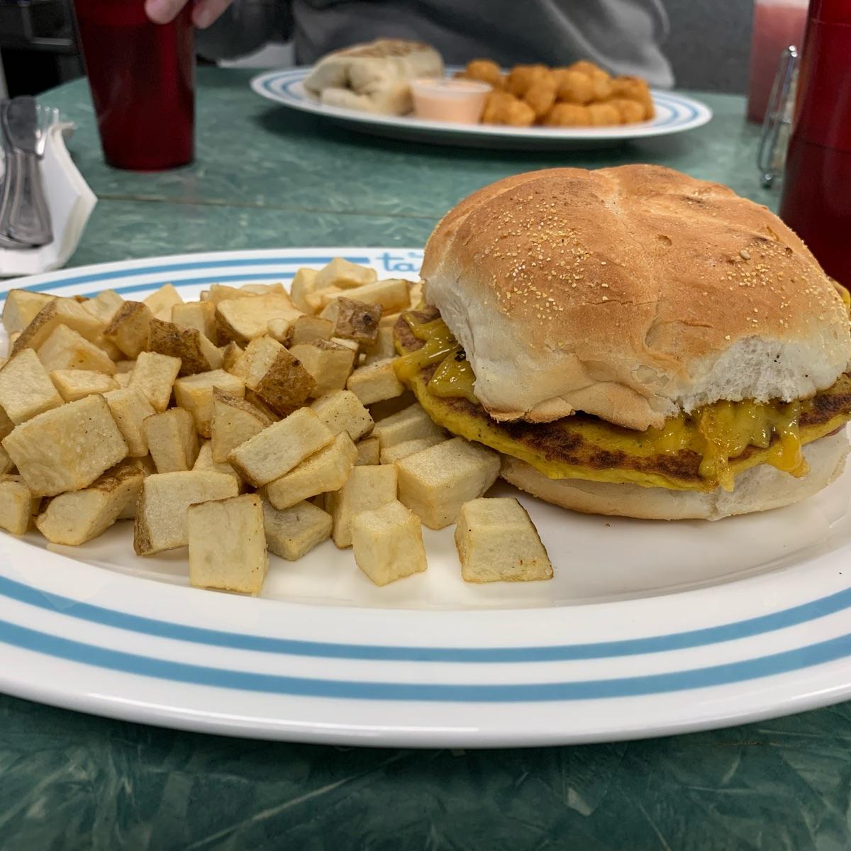 Vegan pork roll, tofu egg and cheese on a roll. Needed to add hot sauce for more flavor but overall a good sandwich. Also ordered it with homefries.