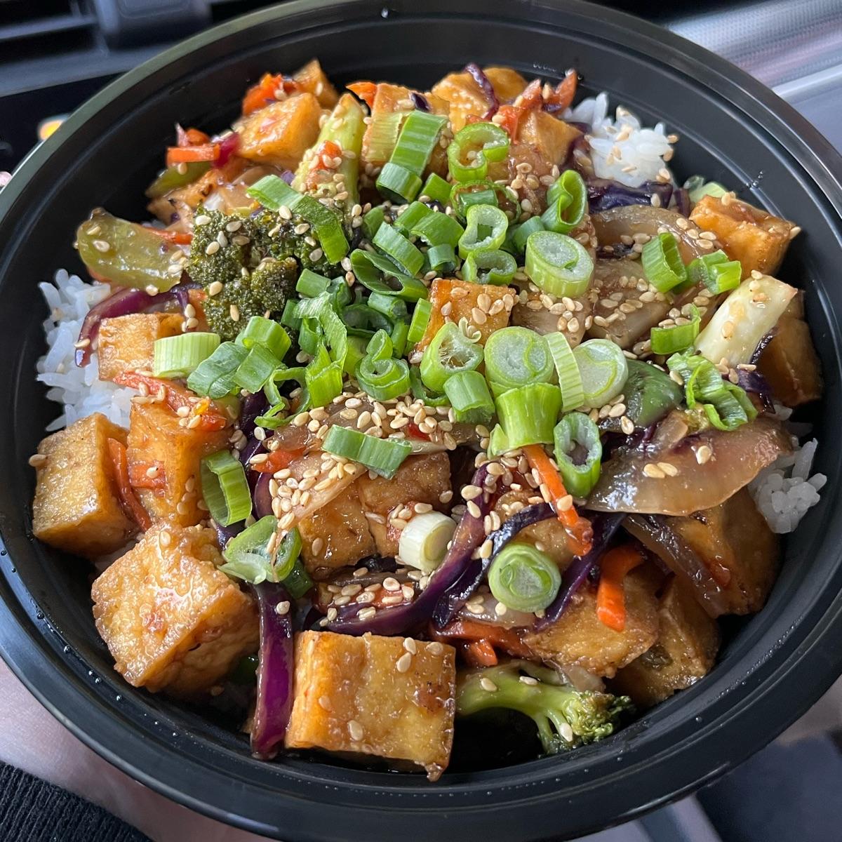 Really hearty bowl, great value. Fried tofu squares with veggies over white rice with a spicy orange sauce. Great flavor with a little kick. Would definitely recommend trying this!