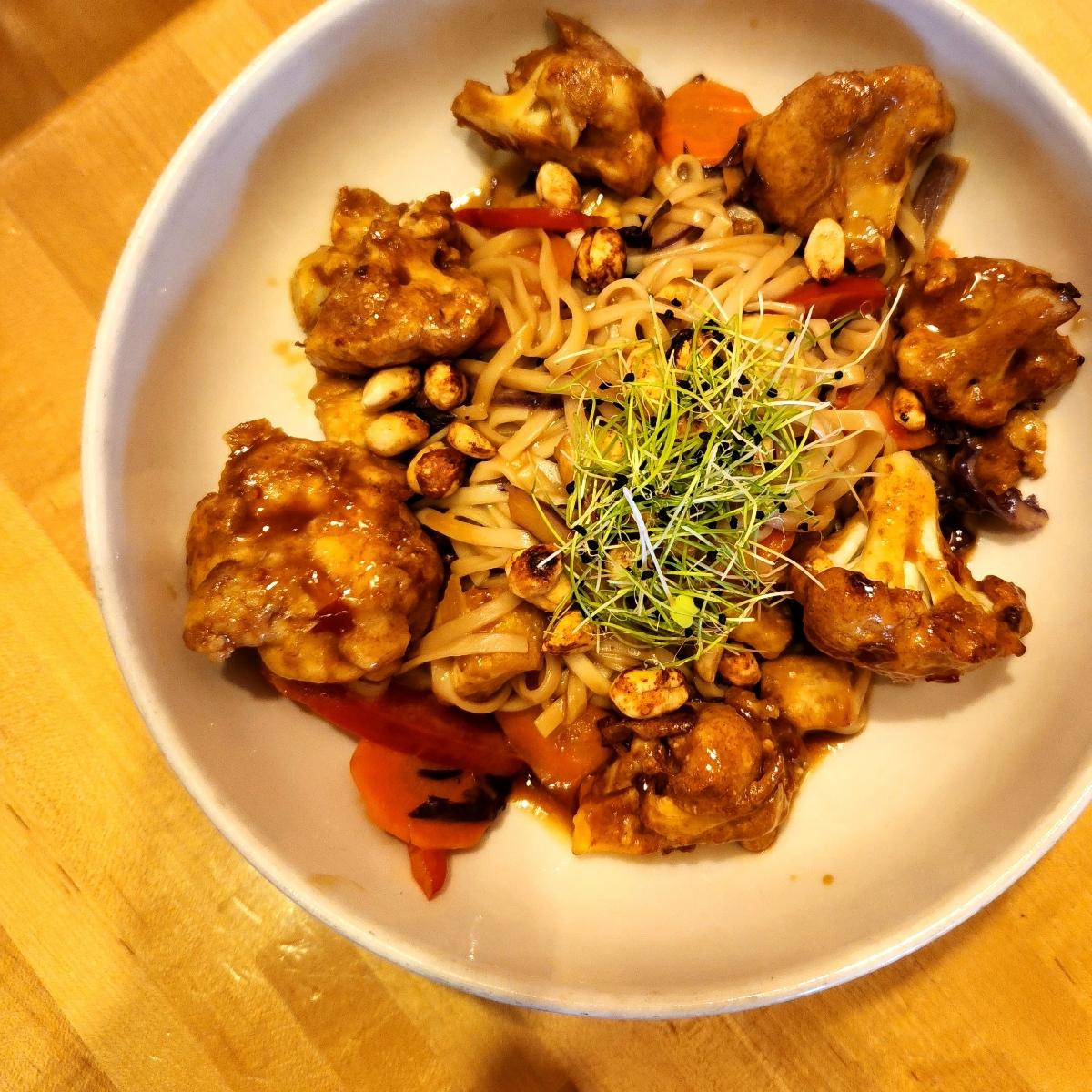Divine! This dish contains lightly breaded cauiflower combined with lots of other veggies and udon noodles in an orange tamari maple sauce. I added tofu as well. It was quite flavorful but not too salty, and definitely enough for two portions.