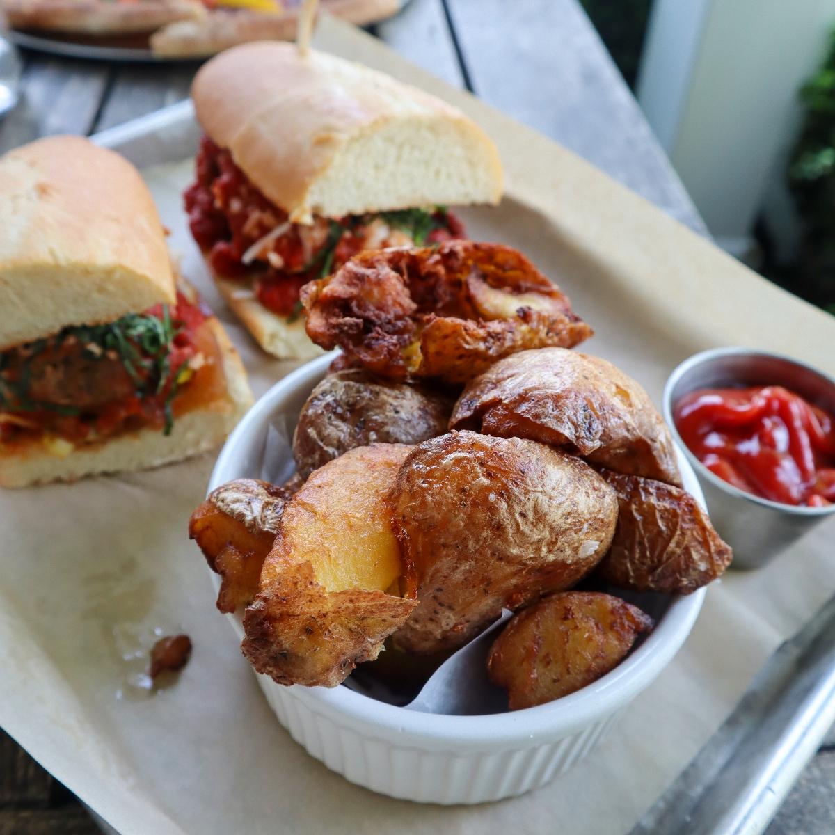 Instead of traditional fries, Harvest has Yukons! This side dish of cut / slightly smashed golden #potato wedges are cooked in olive oil, salt, and rosemary. They're crispy on the outside and light and fluffy on the inside. You can also order these with fried artichoke hearts as well. They have great flavor and make a good addition to their sandwiches or for the table. I'd definitely recommend ordering a side and they are available at all locations.