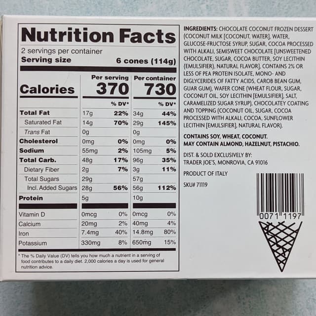 These are fun little chocolate ice cream cones. They're just like the full size ones - they even have that little bit of chocolate at the bottom of the cone. The package says one serving is six cones. That seems a lot to me, though. Since they're little, I think they are a nice treat when you just want just a little something sweet!🍦