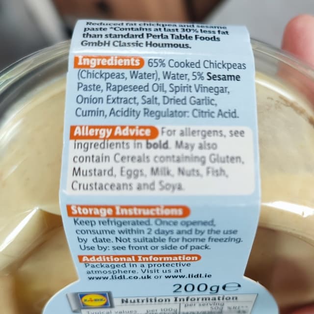 Preso da Lidl in Irlanda. Dopo aver già provato l'hummus "normale" ho preso questo con meno grassi per avere una recensione in più da fare 🙃 non ho sentito grandi differenze sinceramente, la tahina non si sente molto in nessuno dei due (per me male malissimo), in compenso si sente molto il limone/aceto e la consistenza è un po' granulosa, cose che però non disturbano. Costo 0,83 euro.