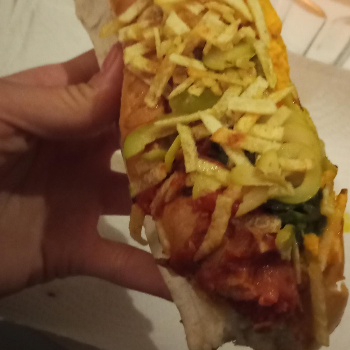 Venía en pan de Viena (super fresco) con mayonesa de zanahoria, pesto casero aceitunas y papas pay.