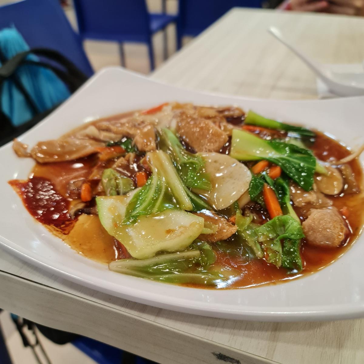 Under $7 for #horfun accompanying leafy #greens and #mockmeat. Broad #ricenoodles' ( #kwayteow) wokked on the spot so order might take a while to churn; not recommended for folks short on lunch minutes. Love the #wokhei though, good things must wait ❣️