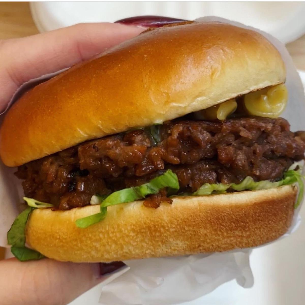 Mac and cheese on a burger and it’s vegan? And a double stack? Yes. It’s as amazing as it sounds.