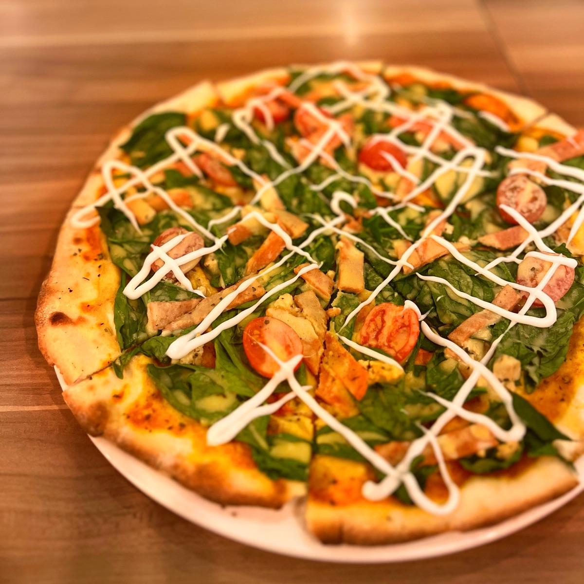 🍕 Umami Spinach Ricotta Pizza w housemade cashew ‘cheese’, ‘ham’ and egg-free mayo for a catch-up sesh w mi dear frienddd :) Love the super crispy thin crust~