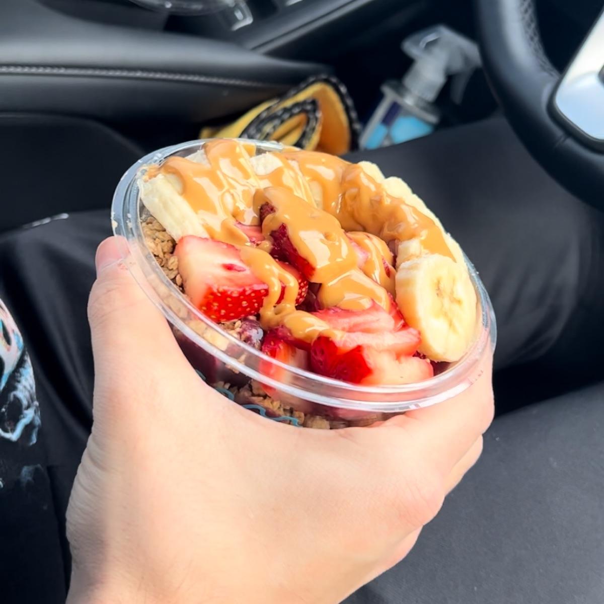 My boyfriend got the build your own bowl. He did açaí base, bananas, strawberries, granola, and peanut butter! It was super tasty and I love how thick the açaí is