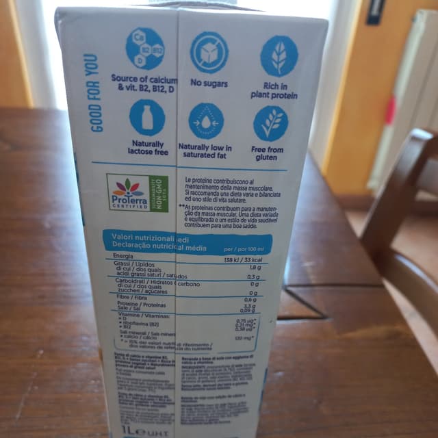 Ottima qualità quella di alpro.Latte di soia senza zuccheri,addizionato di calcio e vitamine,che per me è un valore aggiunto.Gusto delicato,quindi ottimo per colazione,o da usare nei dolci o per preparare panna vegetale.