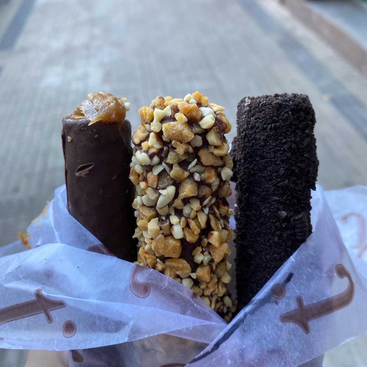 Muuuy ricos. Con uno ya quedás satisfecho; si no sos dulcero te empalaga rápido. Sabores: normal, bañado en chocolate, bañado con maní, bañado con oreo (mi favorito <3)