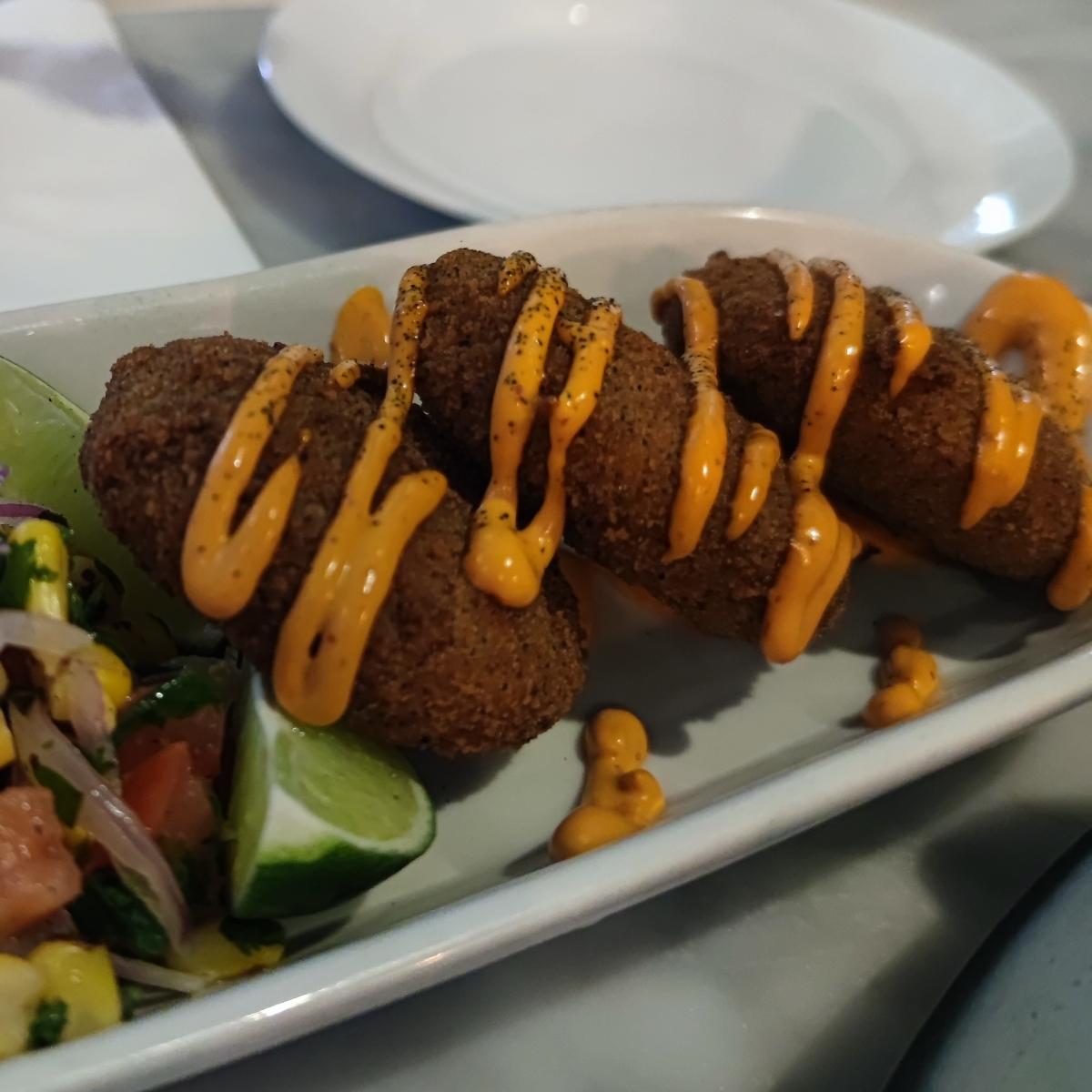 These #vegan #crabcakes were very good. Loved the sauce on top of them.#vegan #vegannyc