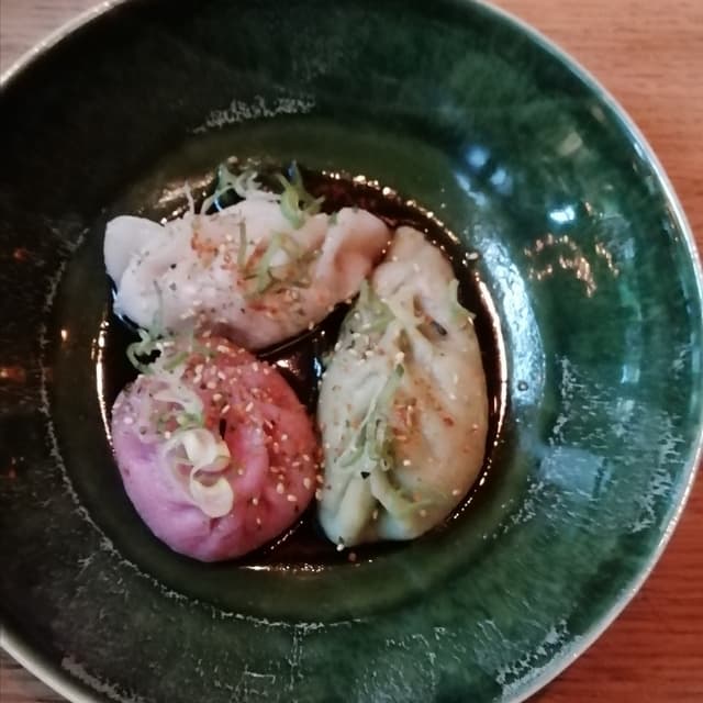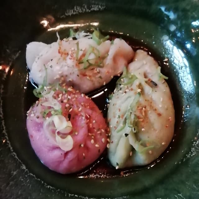 Ravioli dalla pasta meravigliosa con tre ripieni diversi: macinato vegano, funghi shiitake, cavolo cinese immersi in delizioso brodo di salsa di soia.