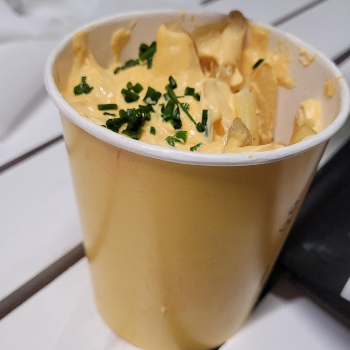 Con cheddar super ricas te re llenas! Lindo lugar hay de todo