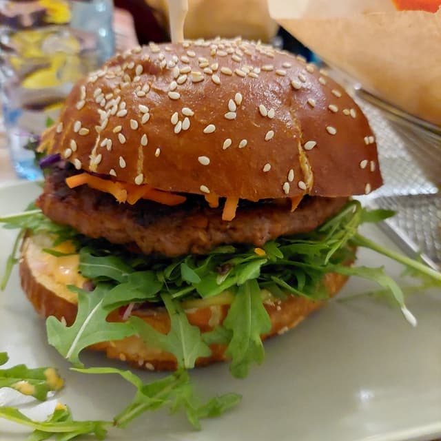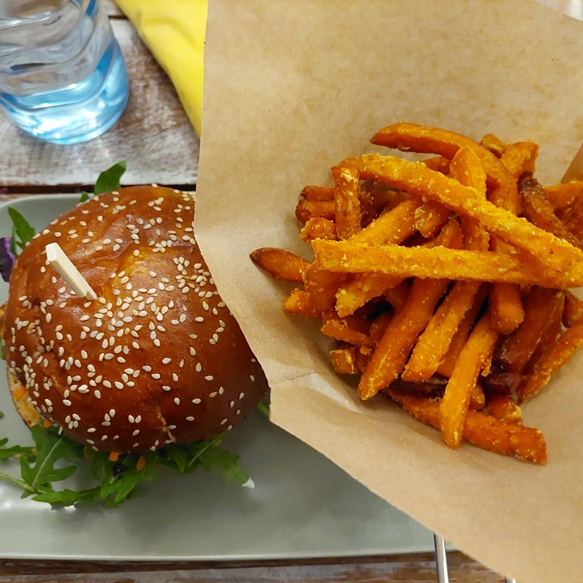 Cheeseburger con possibilità di scegliere tra diversi patties, nel mio caso beyond meat burger. Burger davvero molto buono e grande, anche se il costo è un pochino elevato (circa 20 euro burger + patate dolci fritte)... nel complesso però ne vale la pena!