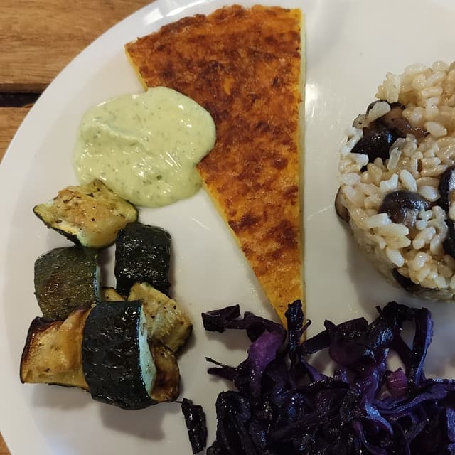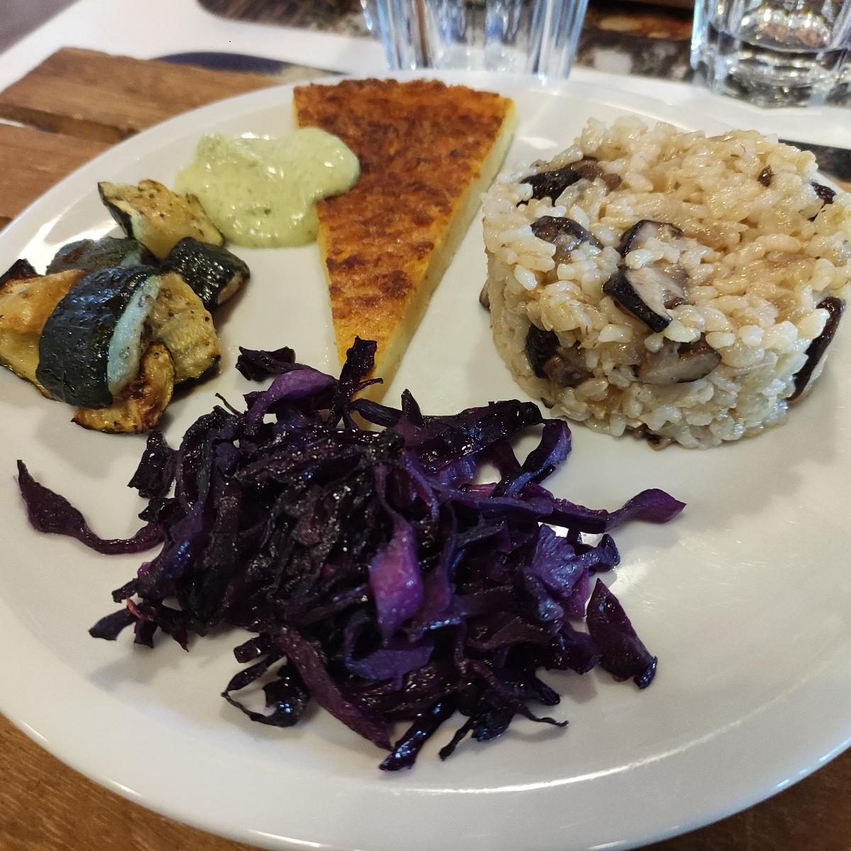 Un piatto unico, sempre diverso, come portata principale 😋 questa volta composto da: farinata di ceci e carote con maionese vegan all'aglio ursino, risotto ai funghi shiitake, cavolo cappuccio marinato e zucchine al forno. Tutto spaziale! 😍 Un piatto completo, macrobiotico e nutriente 💚