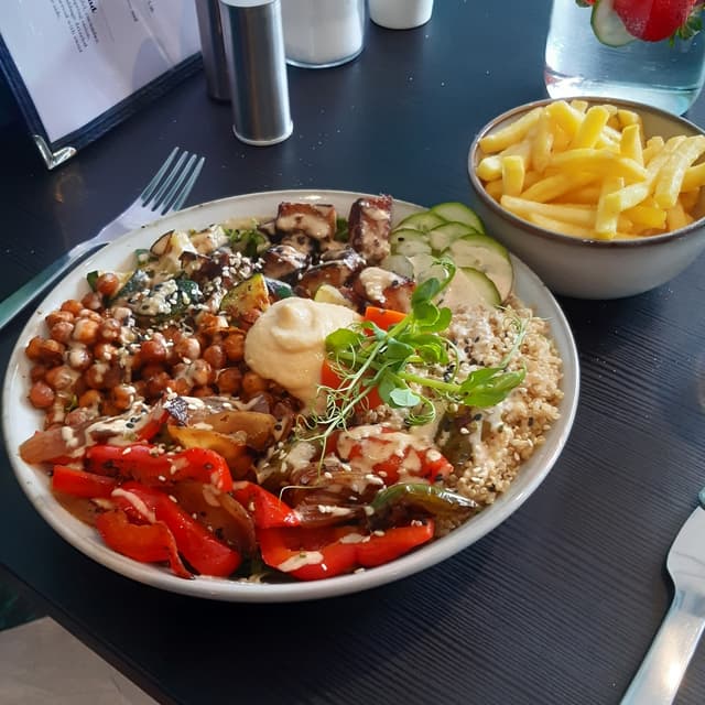 Delicious, we always enjoy coming to PureVegan! Roasted chickpeas, leaves, quinoa, sauteed tofu and veggies :)