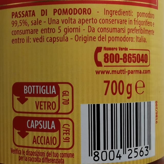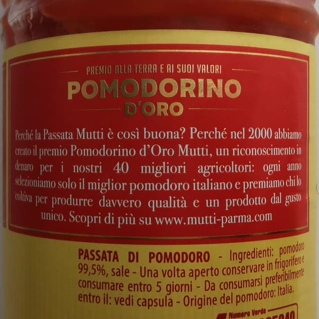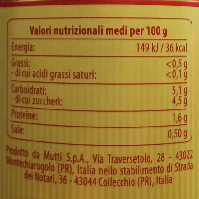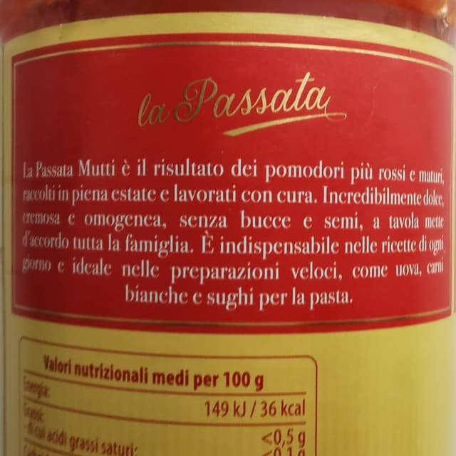 Trovata in offerta all'Esselunga a circa 0,80€. È una passata del tipo fine, molto cremosa prodotta con pomodori italiani. Io a dir la verità preferisco la consistenza di quelle rustiche ma usata sulla pizza va benissimo anche questa. Il sapore è ottimo, non acido, abbastanza fresco non sa di sugo cotto, non si deve aggiungere sale poiché è già salata. Bottiglia in vetro. Mutti si conferma una buona scelta.