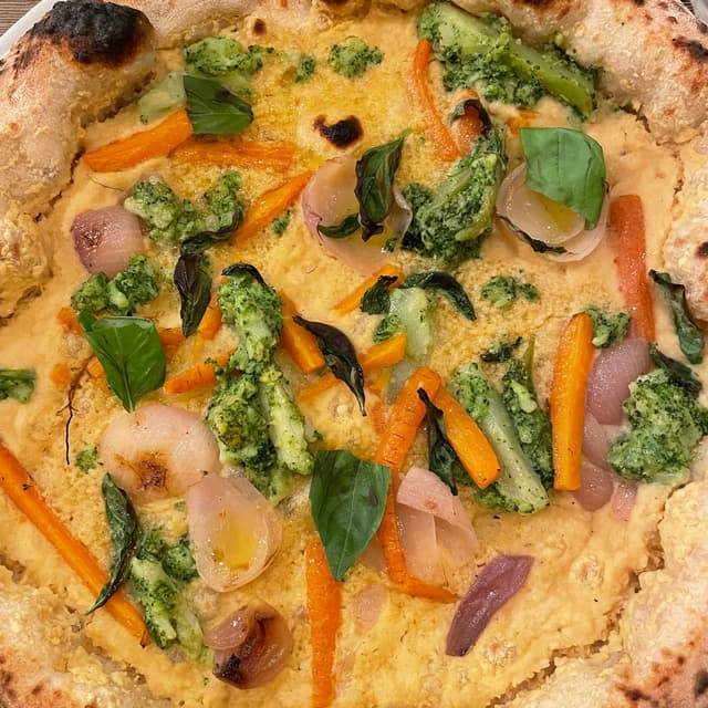 La pizza vegana di Marghe del momento con base di hummus e verdure. Gusto molto delicato, l’impasto della pizza di Marghe è sempre molto buono