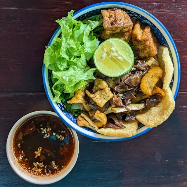 Brownish rice noodles, fried tofu, soy 'fish cake', black fungus, lettuce, and crackers. The fried tofu was definitely not like pork char siu which is typically featured in the traditional meat version. However this was very tasty, toothsome, and enjoyable in its own way! The black fungus and crackers also added a great crunch. Served with soya chili sauce and lime. Would highly recommend trying this vegan version of a Hoi An regional classic. (65,000 VNĐ) #vietnamese #vietnam #veganvietnamese