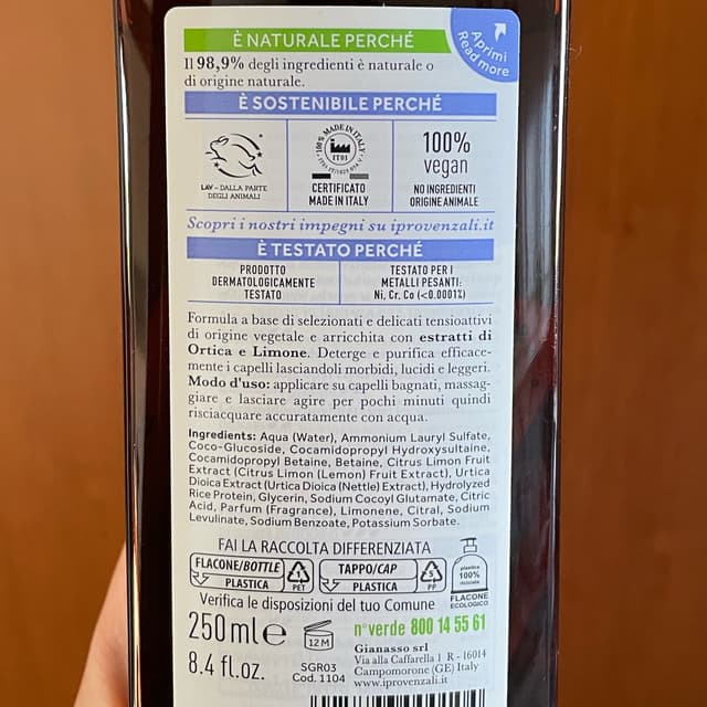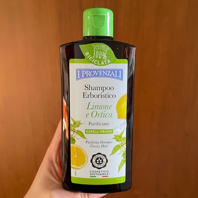 Shampoo purificante per capelli grassi, con limone e ortica. Buon profumo si sente il limone.