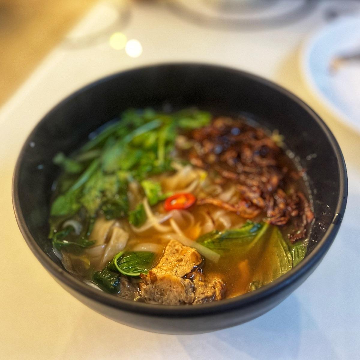 Savoury flat rice noodle soup with complex, distinct flavours of basil, mint and herbs. Served with soy-based ‘sausage’ slices, gluten and other ingredients. Like the soup!! :) #sgsoup #vietnamese