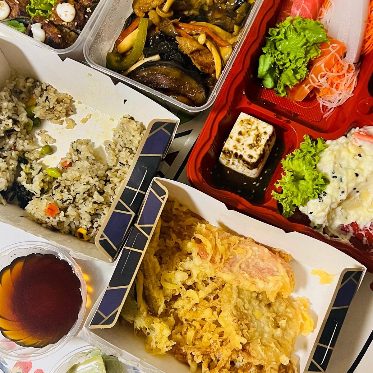 Includes a matcha tofu pudding (or daifuku / mochi if they have stock), sea-flavoured konnyaku-based sashimi, crunchy enoki and mixed veg tempura w a savoury dipping sauce, creamy and slightly tangy potato and carrot salad, chilled / hiyashi silken tofu, marinated wakame salad w sesame seeds and tasty soy-based ‘unagi’ maki stuffed w avocado.