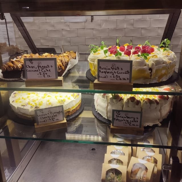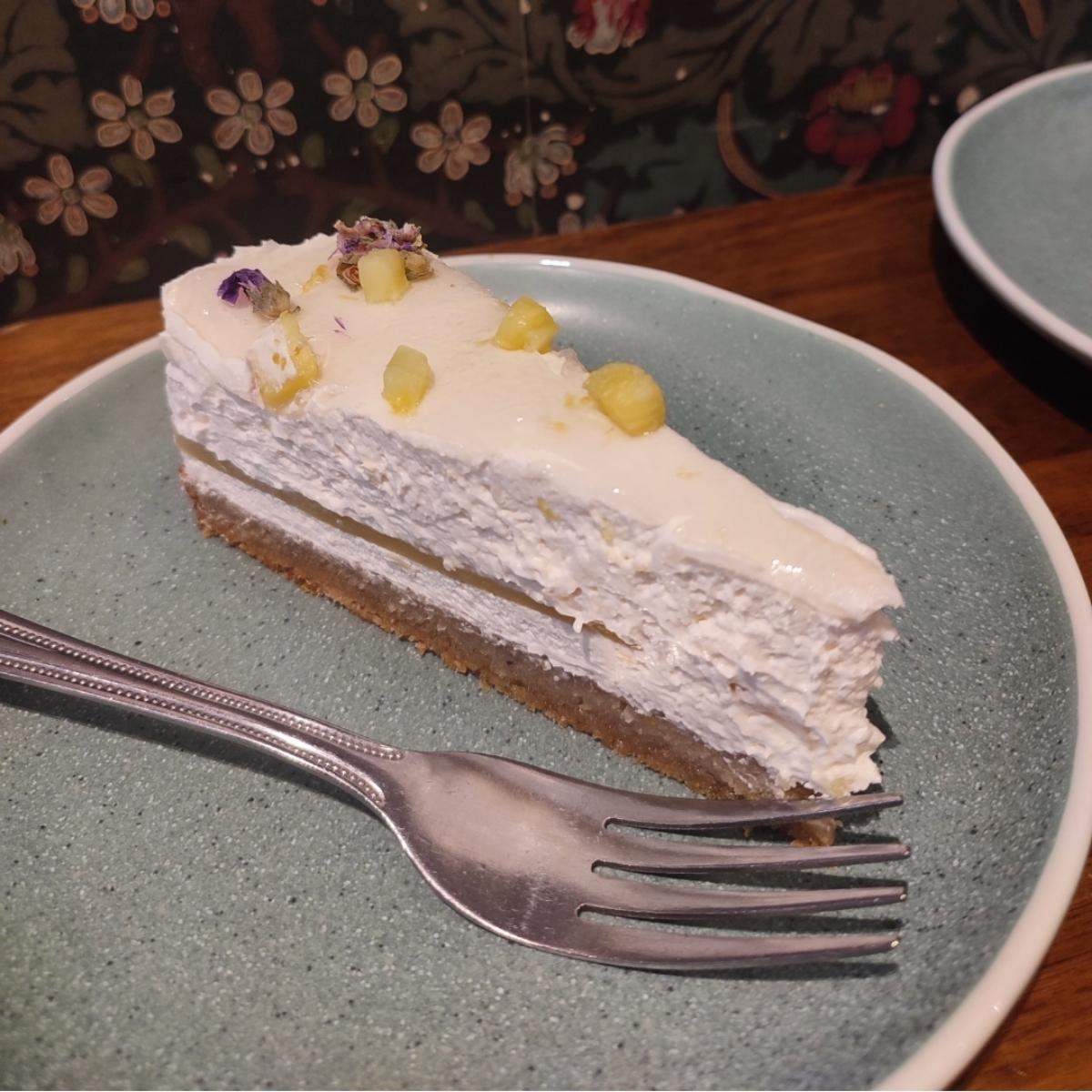 Visto che a cena eravamo troppo pieni per prendere il dolce abbiamo rimediato tornando il giorno dopo per colazione 🙃 c'erano un sacco di torte e dolcetti meravigliosi, questo è quello che mi ispirava meno ma lo ha scelto il mio ragazzo. Non mi è piaciuto perché è proprio quello che sembra: una base di biscotto da classica cheesecake, panna montata con leggero aroma di limone, strato di gelatina simil-plastica all'ananas, non proprio il mio genere visto che non amo le cose pannose. Anche il prezzo di 6,50 euro mi è sembrato un po' alto per la dimensione. Al mio ragazzo non è dispiaciuta ma ha ammesso che non era un gran che.