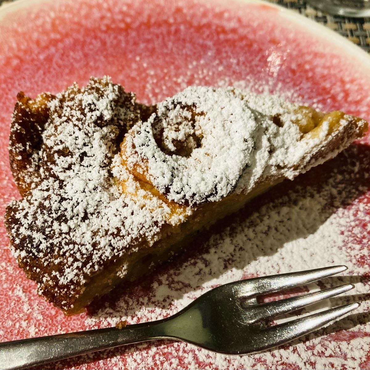 Ultima portata del menù degustazione. La famosa torta di mele del Pum Rus 🍎 (nel dialetto locale significa mela rossa). Prima di essere un ristorante il posto era un’azienda agricola (e lo è tutt’ora). E in questa azienda, tanti ma tanti anni fa ho avuto il mio primo lavoro. Ho fatto una stagione a raccogliere pesche, mele e kiwi. Il frutteto di mele era il più grosso e già ai tempi producevano e vendevano torte di mele. Questa è la versione vegana della loro torta. Soffice, con tante mele all’interno ma leggermente troppo dolce per i miei gusti.