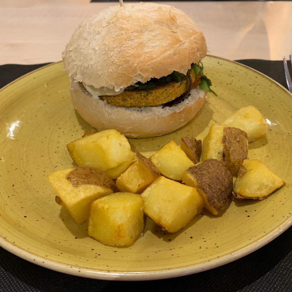 Rica hamburguesa cuyo toque especial lo aporta la ensalada de wakame y su salsita, además lleva lechuga y tomate y se sirve con unas patatas que entran que es un gusto.