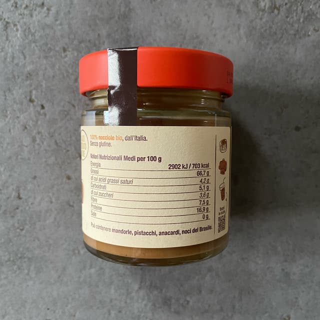 Ottima crema 100% nocciole, gusto ricco e naturalmente dolce. Come tutte le creme del marchio, sono un po’ troppo liquide, ma poco male.