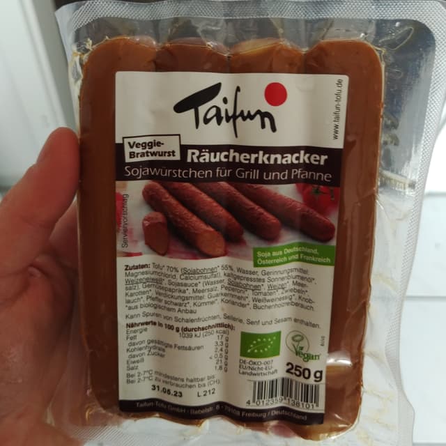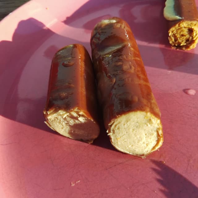 The smoked crackers are made from smoked tofu. The consistency and taste are much better than the barbecue crackers made from natural tofu. However, the consistency is not 100% reminiscent of bratwurst, but it is convincing. Mustard goes very well with it.
