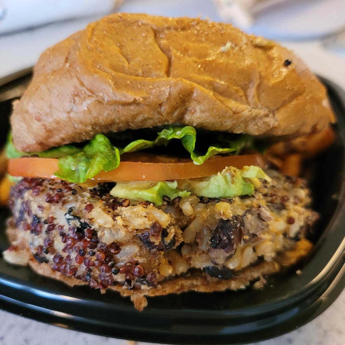 (I ordered mine without sriracha/onion.) I like that this place has a housemade veggie patty instead of your usual Impossible/Beyond. It's made of brown rice, black beans, quinoa, and seasonings! It tastes very good, seems to have a little kick, and is very thick - just falls apart pretty easily. I still very much enjoyed mine and would recommend it if you're in the area.