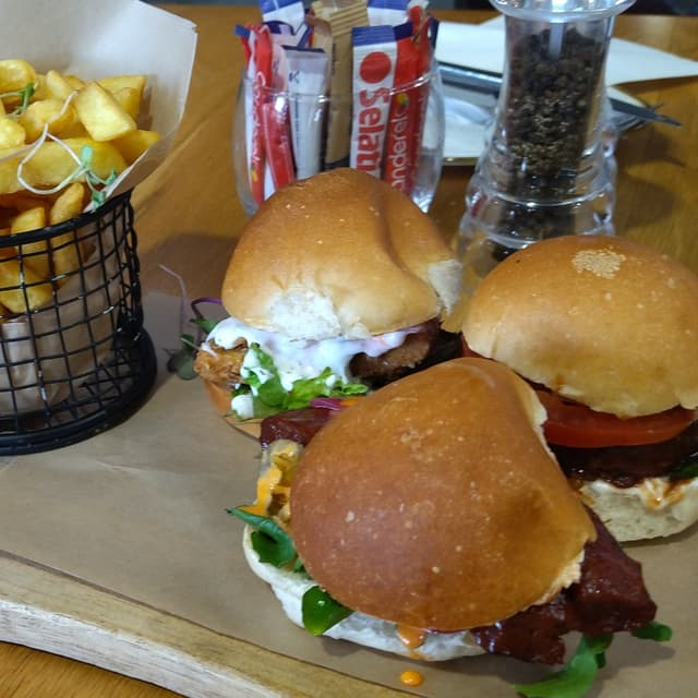 3 delicious mini burgers (with a side of chips): a battered chicken, a spicy rib and a classic burger. All are saucy, mouth watering, guilty-pleasure, comfort food that explodes with flavour.