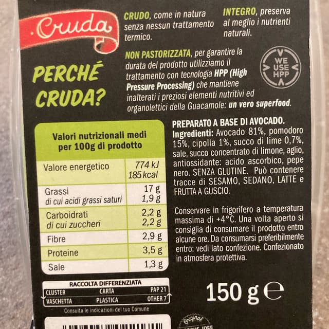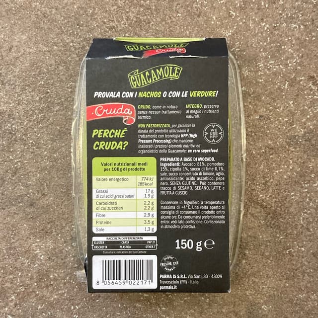 Sembra appena fatto, con pezzi di avocado e pomodorini. Lista ingredienti ottima. Tuttavia preferisco i sapori più decisi mentre questo guacamole rimane abbastanza neutro. Acquistato online su Cortilia a 3,39€ (maggio 2023)-150g