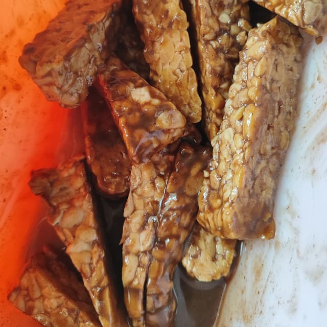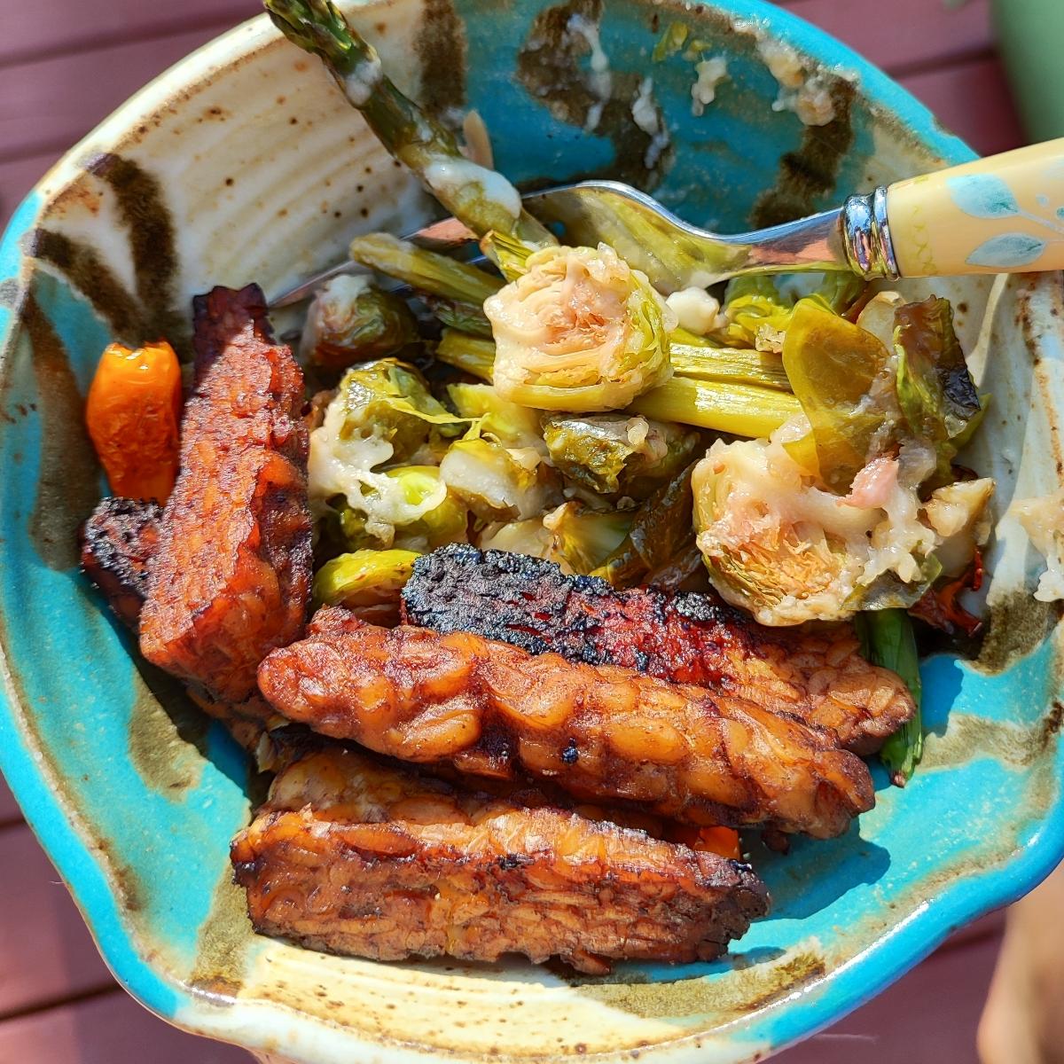 I haven't had any #tempeh since leaving Indonesia 5 months ago ! So it was very nice to have a meal with this. We marinated it in a sesame ginger sauce and baked it in the oven. Delicious dinner along with some asparagus and brussel sprouts baked with #miyokos liquid mozzarella! #organic #nongmo