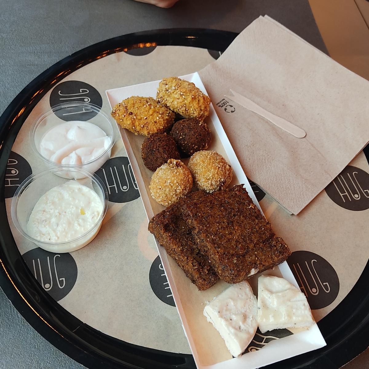 Mix aperitivo con olive ascolane con macinato di soia, arancini, polenta fritta, mozzarelle veg in carrozza, formaggio veg che secondo me come gusto sembra grana