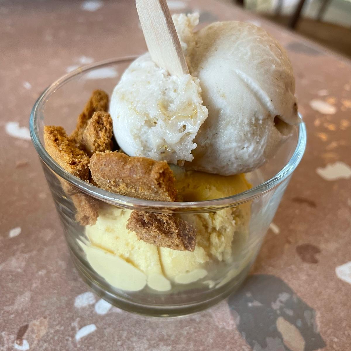 The top scoop is the banoffee. The banana isn’t overpowering, but it is quite sweet. Also found it to be a little on the icy side. #icecream #veganicecream #gelato #vegangelato #banofee
