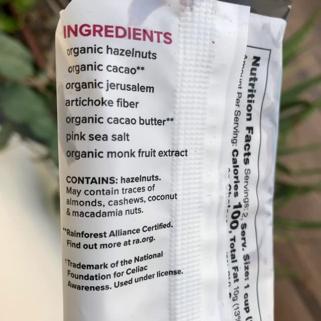 Si están buscando el chocolate sin azúcar, ¡probarlo! Todos los ingredientes son orgánicos, limpios y súper interesantes. Hay certificación del Rainforest Alliance. Mi aperitivo después del gimnasio para mis antojos. Mantener refrigerado.