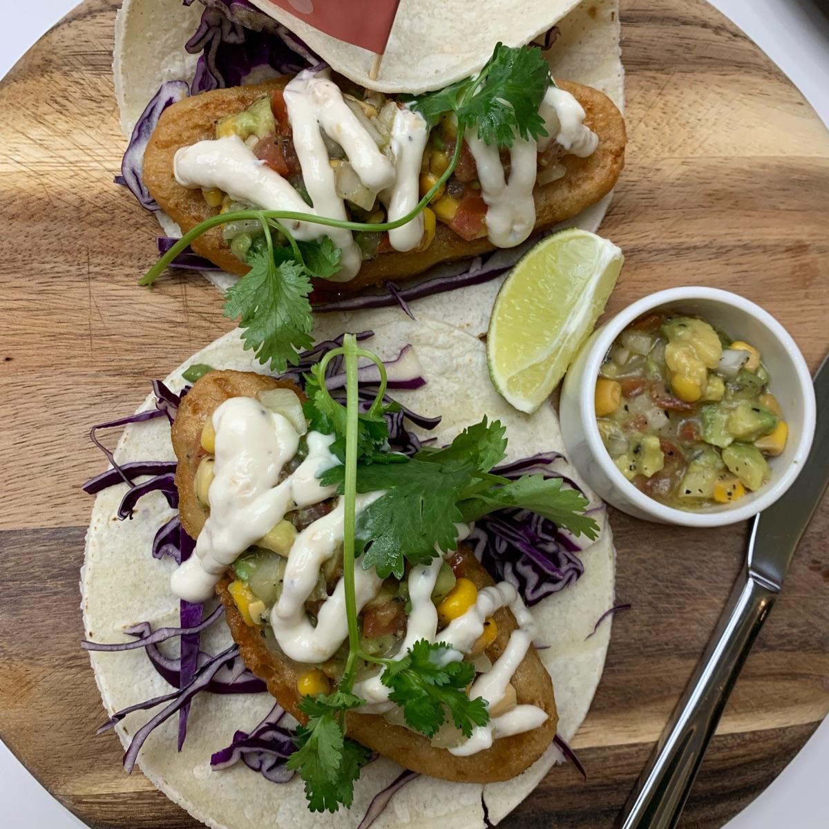 Love the light crispy batter and inside texture of the fillet accompanied by an assortment of lovely greens and tangy lemony sauce. #tacos #veganfish
