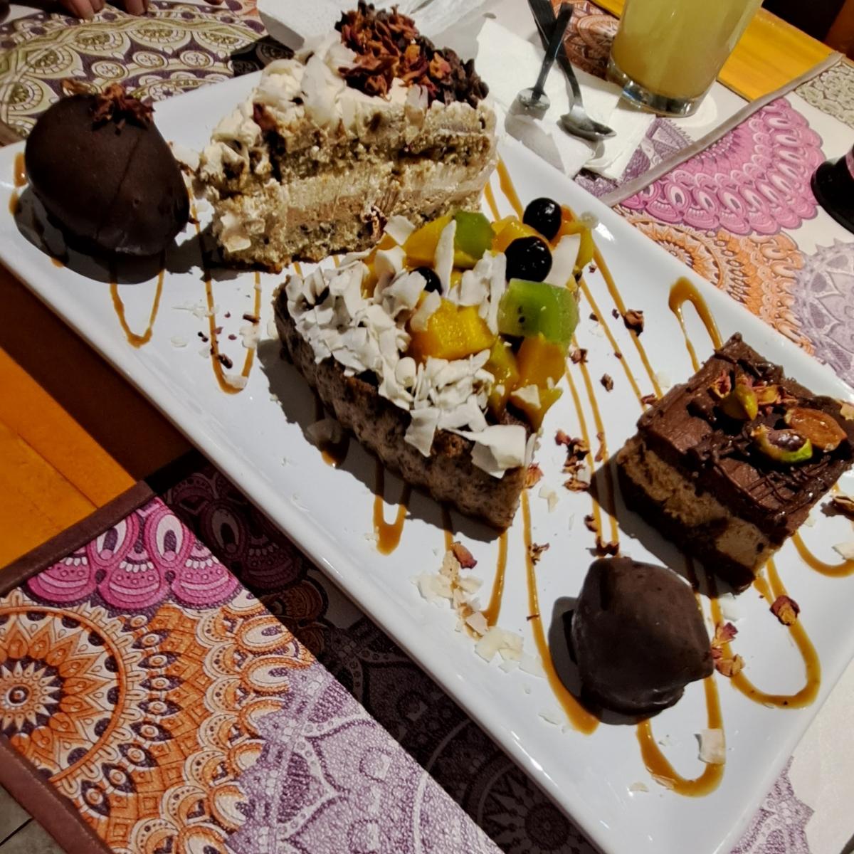 Pedimos el postre "un curioso dulce", es una degustación de postres de la casa, vienen 3 tortas, 1 trufa y un dátil relleno. El precio es super barato considerando que en general es lo que te cobran una sola porción de torta ($2.660 al 01/06/2023). Las tortas son ricas, bastante especiadas. El dátil muy bueno, relleno de ddl y la trufa rica, algo pastosa. La presentación super prolija como se ve en la foto. El local lo atiende la dueña entiendo que es brasilera, muy amable.