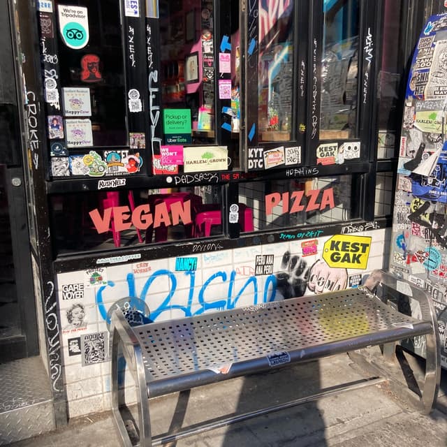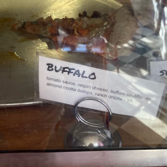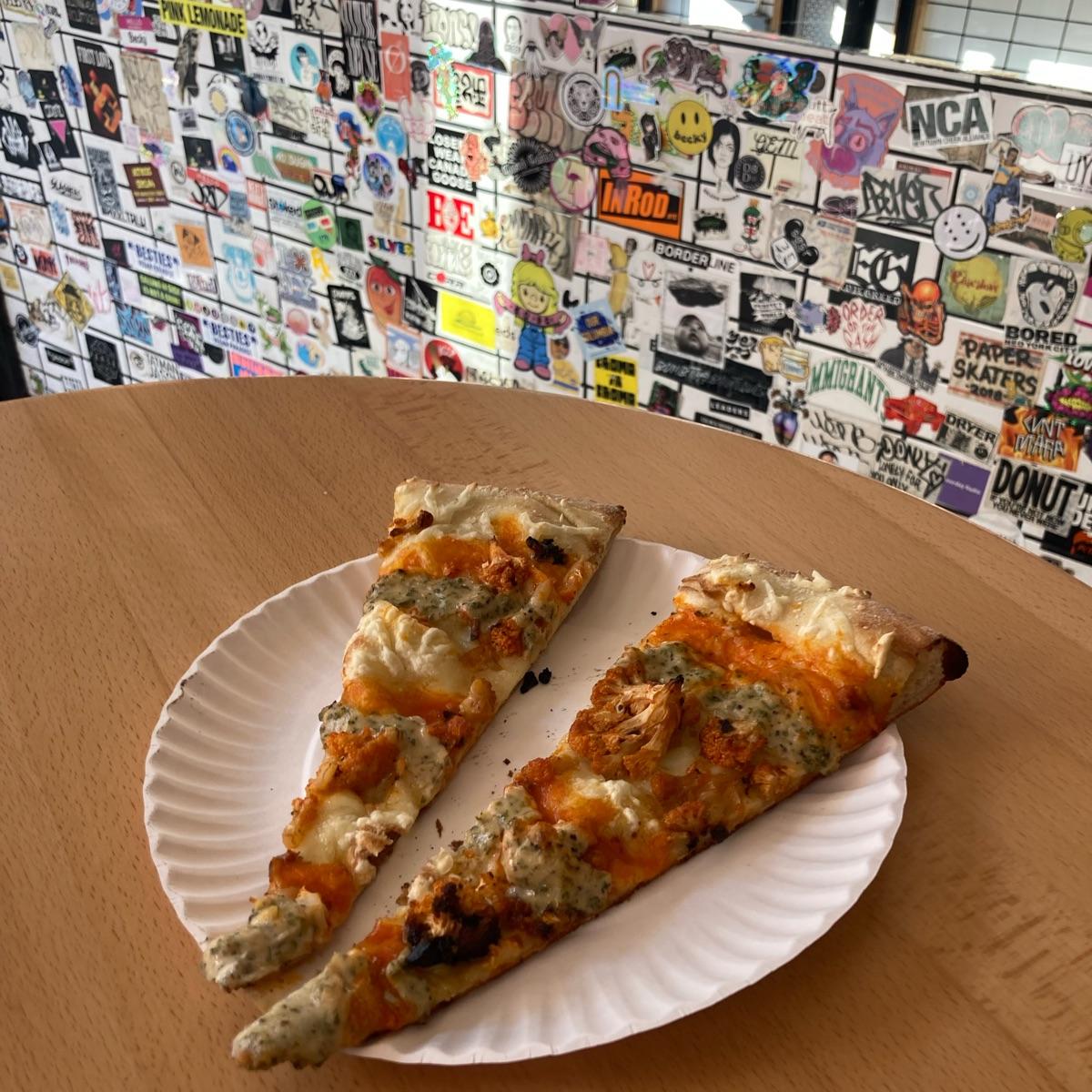Great #vegan #pizza spot in Brooklyn, we shared a slice of this wonderful pizza with #tomato sauce, #vegancheese, buffalo #cauliflower, #almond ricotta, and ranch drizzle.
