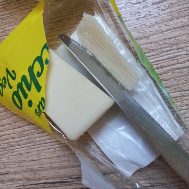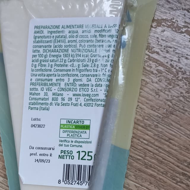 Formaggio 100% vegetale che ricorda molto il sapore di pecorino dolce semistagionato. Si può affettare e grattuggiare. Se si taglia a scaglie sottili si può far sciogliere in padella sopra delle verdure (io lo ho provato sopra le zucchine).