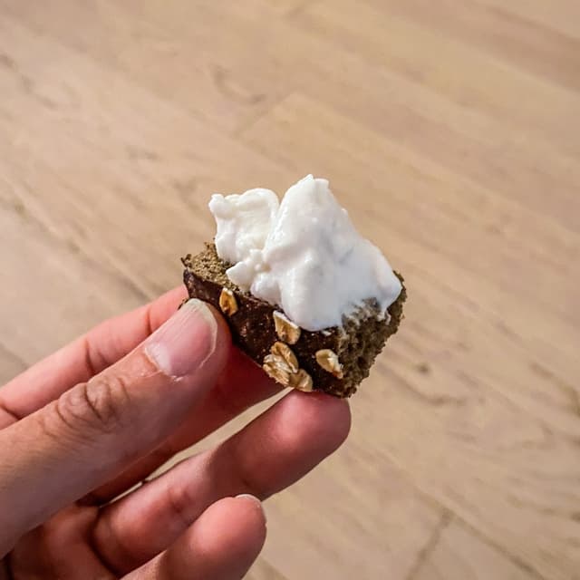L’avevamo presa e “tenuta da parte” per fare qualcosa di fantastico ma… La voglia di assaggiarla al naturale ha preso il sopravvento 🙂 #pane integrale multicereali e #stracciatella del #cashewficio: è fantastica! Si spalma facilmente e la consistenza è ottima perché non si “perde” sulla fetta di pane.