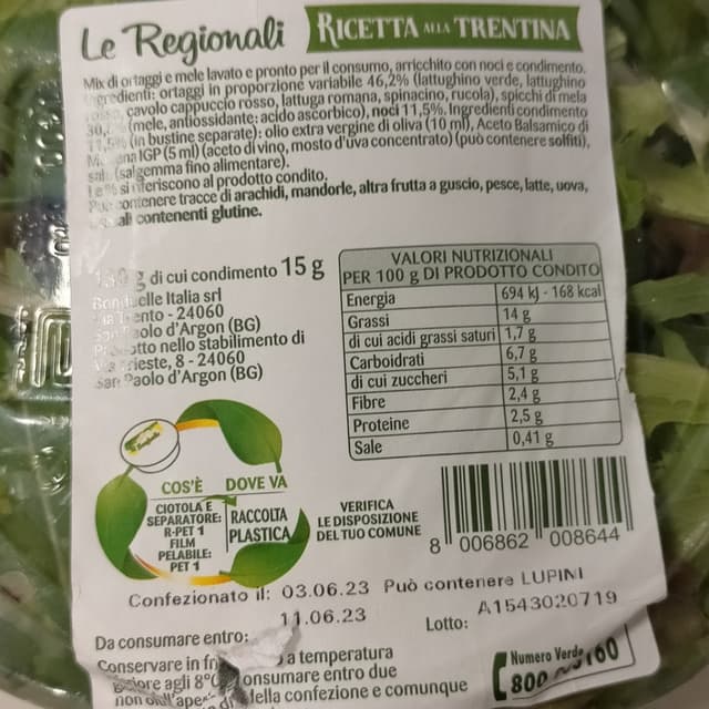Piatto pronto con vari tipi di insalata,noci e mele, con incluso aceto balsamico, olio, sale e forchettina. Molto utile da portare al lavoro e gustoso