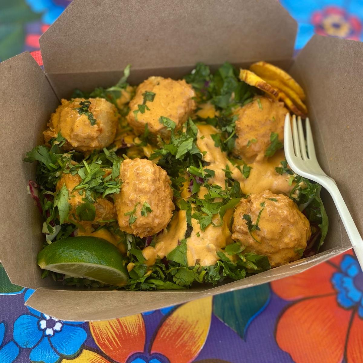 Calypso Southwest food cart has a variety of vegan options that offer an original spin on Southwest cuisine with lots of choices for customization, and generous portions to boot! This Sun Rice Bowl includes fluffy white rice cooked with coconut milk 🥥 , topped with super greens slaw, cilantro, and your choice of protein and sauce. The two vegan protein options are a Black Bean Sweet Potato Hash 🫘 or a Yo, Ho, Ho Coconut Rum Tofu. I always opt for the fried tofu, which comes breaded in panko breadcrumbs and shredded coconut. 😋 The vegan sauce choices include an avocado herb sauce 🥑, coconut chipotle, tahini vinaigrette, or pineapple habanero salsa. I went with the coconut chipotle sauce and it of course paired perfectly. This dish also comes with a couple fried plantains on the side! 🍌