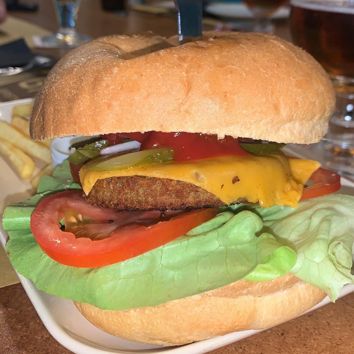 Classico hamburger vegetale con patty di verdure, lattuga, pomodoro, cetriolo, pomodori secchi e cheddar vegetale, il tutto accompagnato da patatine.