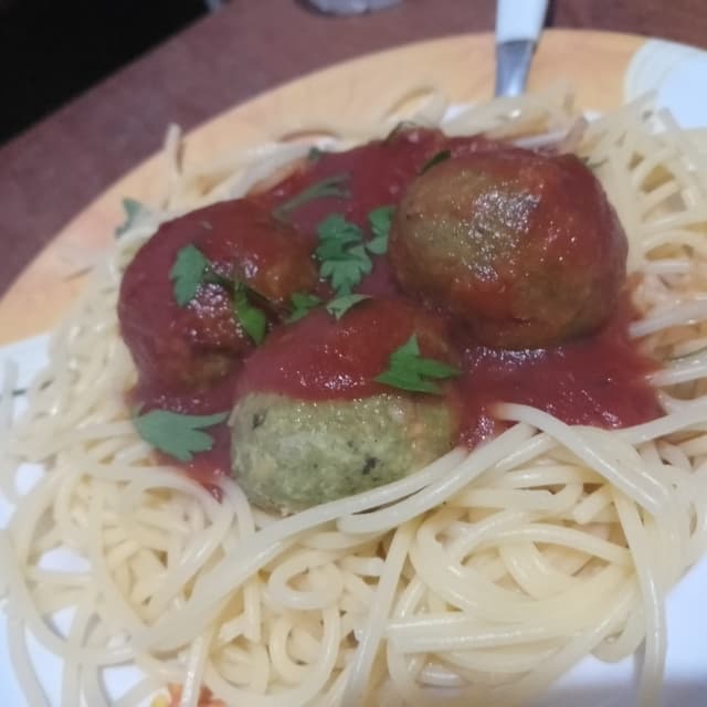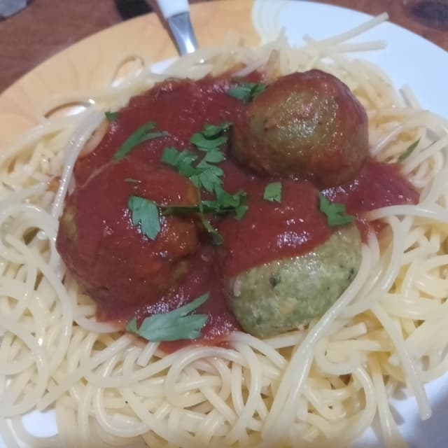 Mi abuela me los envío por pura casualidad y puedo decir que están buenísimos. Spaghetti con albóndigas de garbanzo y arveja.