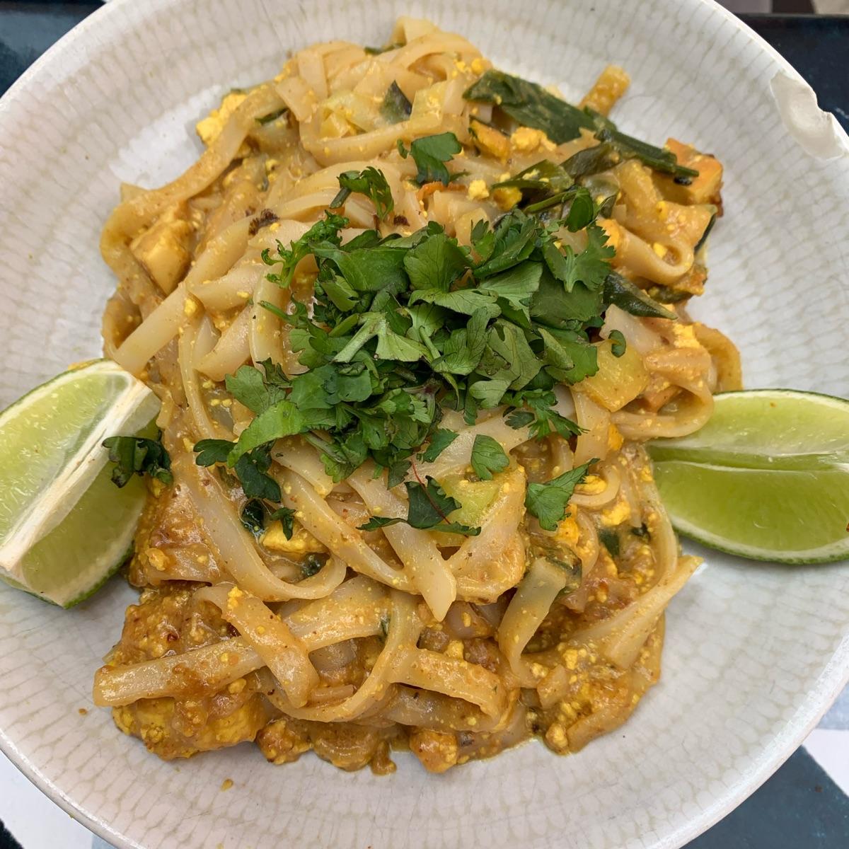 Pad Thai de fideos de arroz con tofu ahumado y tamarindo con sus cacahuetes tostados,cilantro y lima #vegan #veganisnotscary