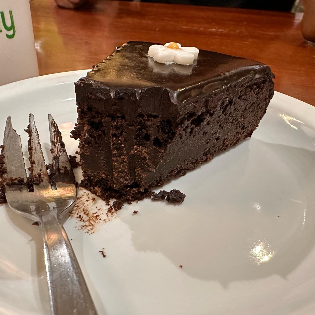 The #chocolate is strong with this one đȘ They werenât kidding about the fudge đ« This was incredibly dense! It had an interesting layered texture too đ§ Soft & creamy on the top, followed by a hard & thick middle, and finally a softer spongy bottom đȘž It wasnât too sweet & had a light #darkchocolate aftertaste in spite of it in no place saying that it is. No almond aftertaste either, just its thickness! This oneâs a win for me âïž They donât always have #vegancake options, so YMMV if youâre going to be here đ