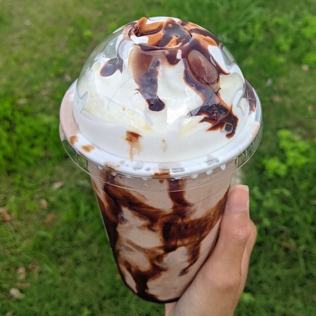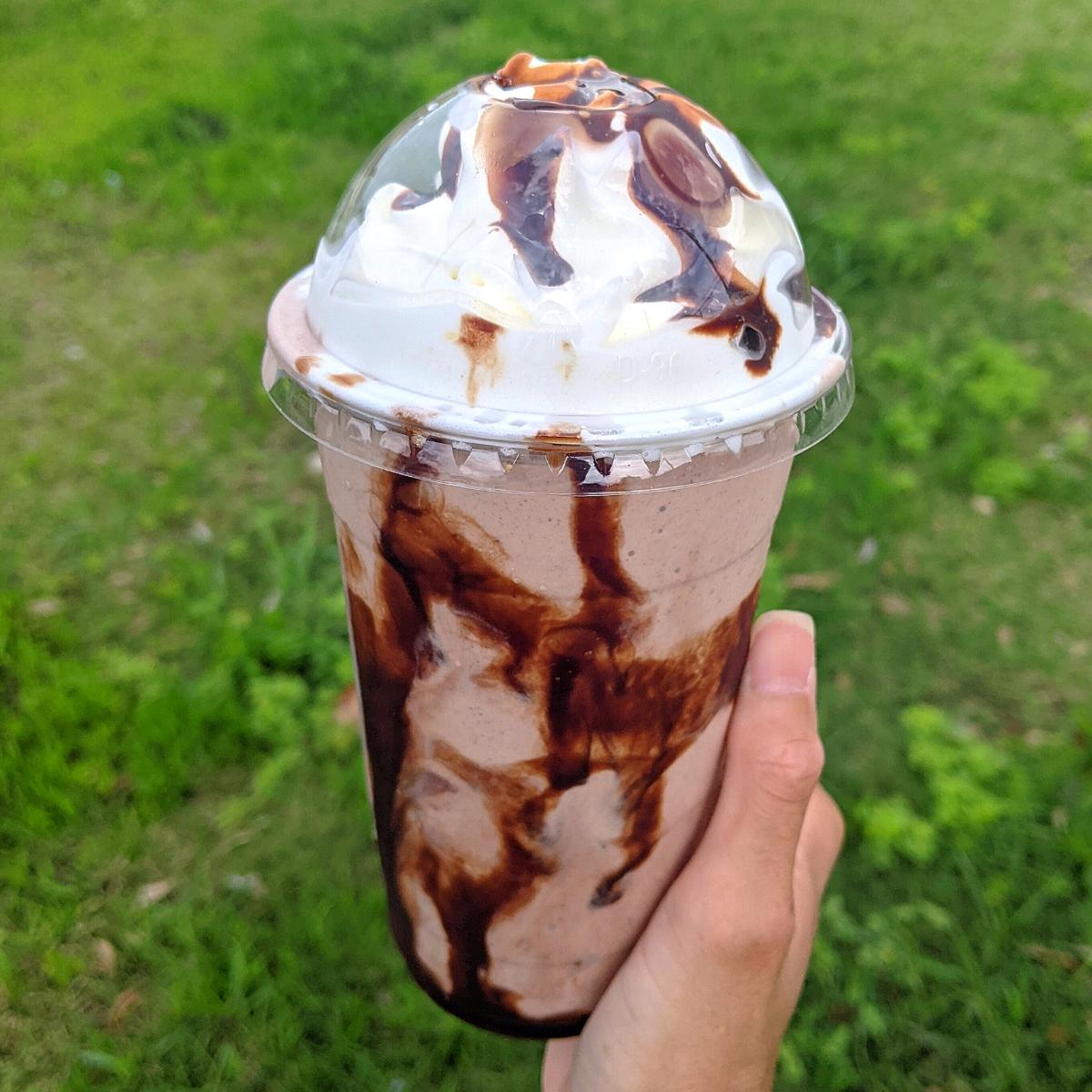 It's a generous 20 oz size and it it's made with oat milk based soft serve, almond milk, cacao powder, chocolate syrup, and topped with whipped cream and chocolate sprinkles.