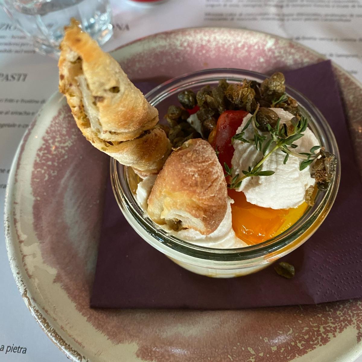 La ricottina è cremosa al punto giusto e l’umami si sposa benissimo con la dolcezza dei pomodorini. I capperi fritti - che idea geniale friggere i capperi! - aggiungono sapidità e croccantezza, e i filoncini di pane alle olive sono morbidi e tiepidi, l’accompagnamento perfetto per questa delizia in vasetto.